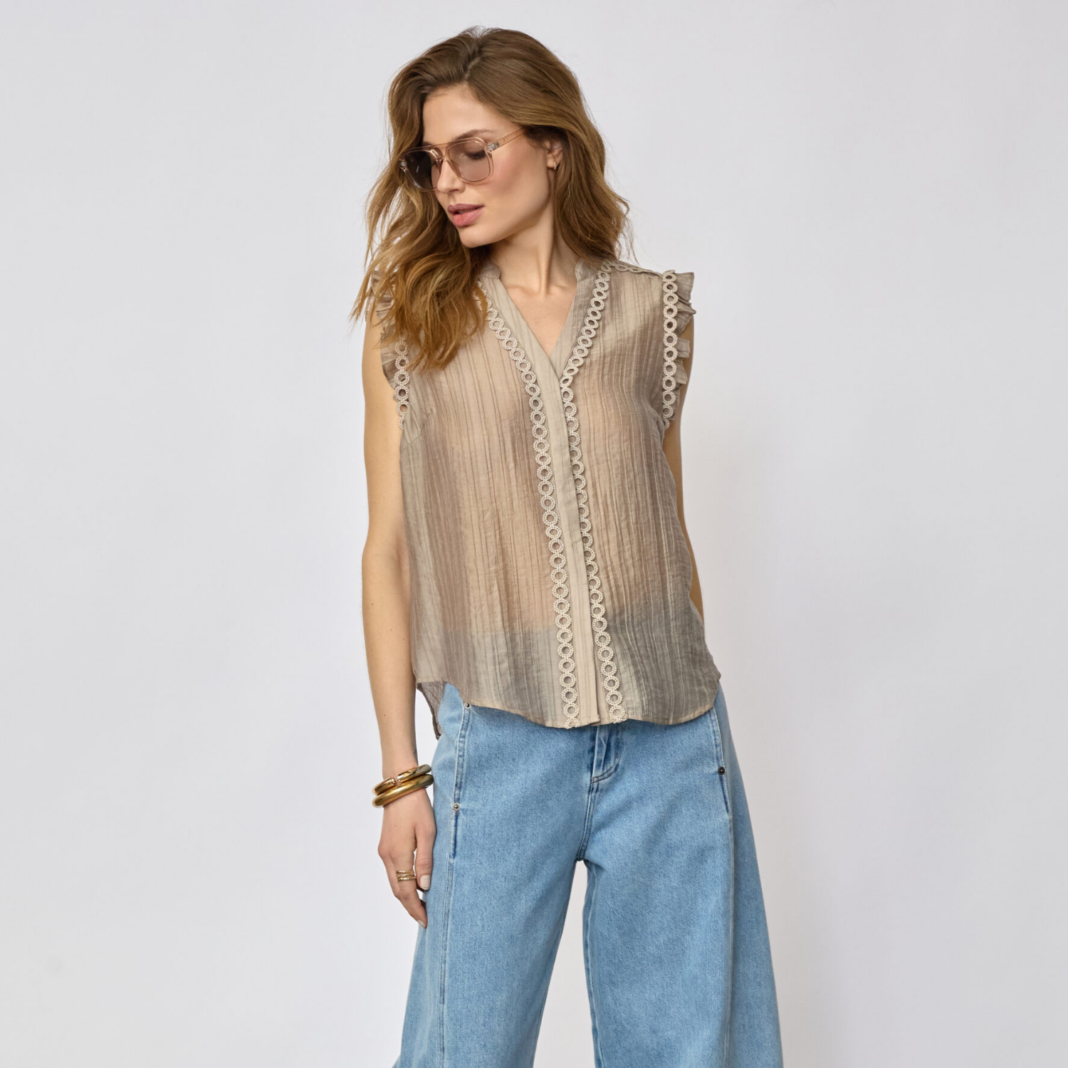 Smuk sandfarvet flæse top fra Co Couture uden ærmer.