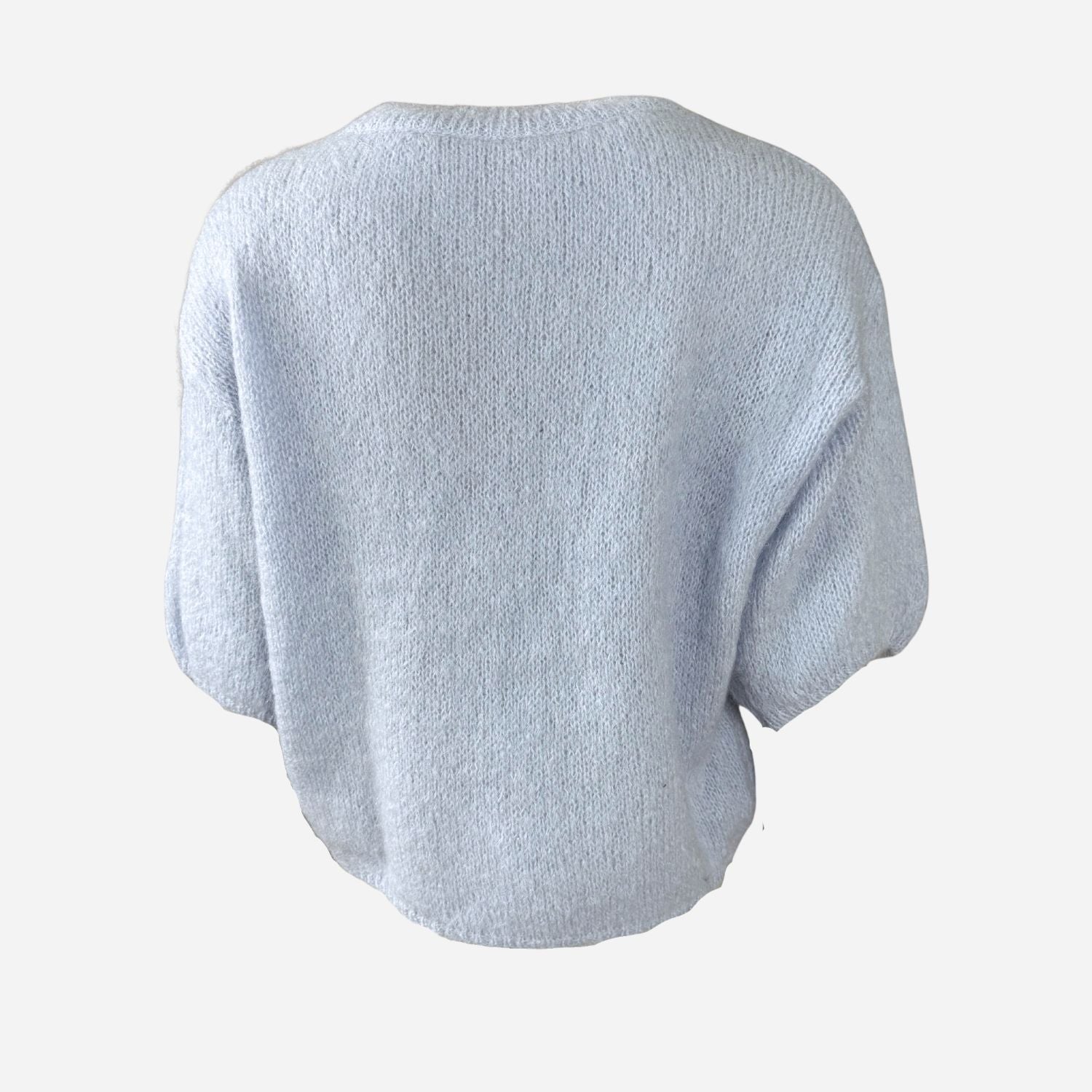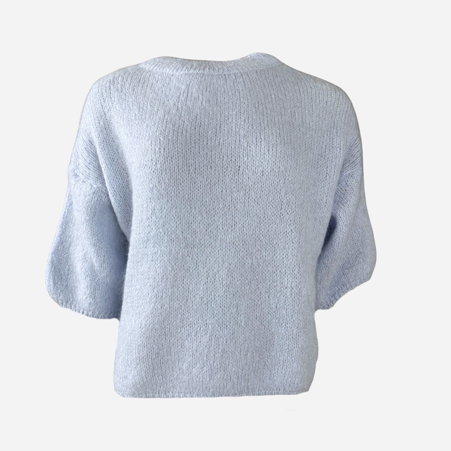 Lyseblå vamset mohair strik fra J By J med korte ærmer.