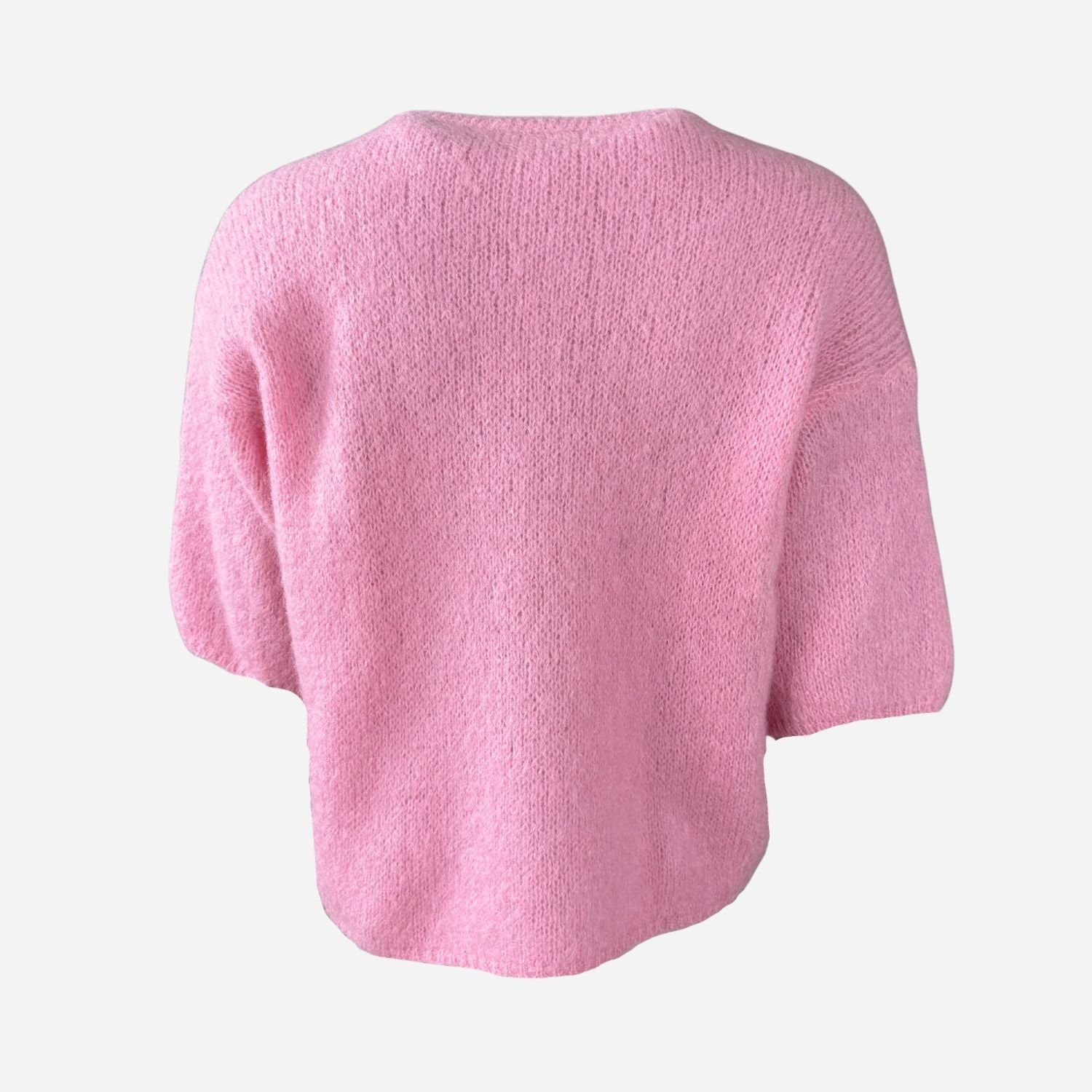 Lyserød vamset mohair strik fra J By J med korte ærmer.