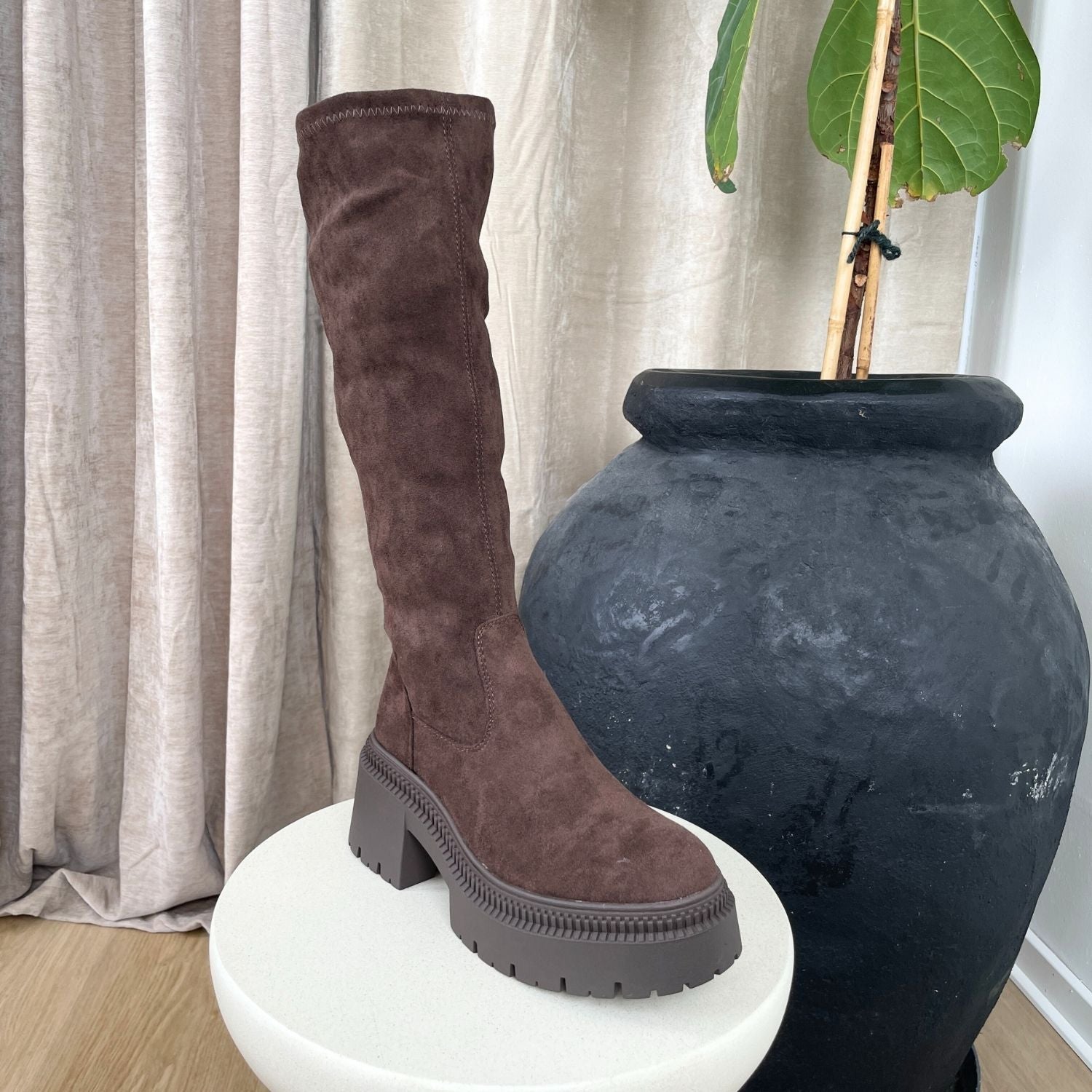 Lange brune støvler fra J by J i imiteret ruskind.