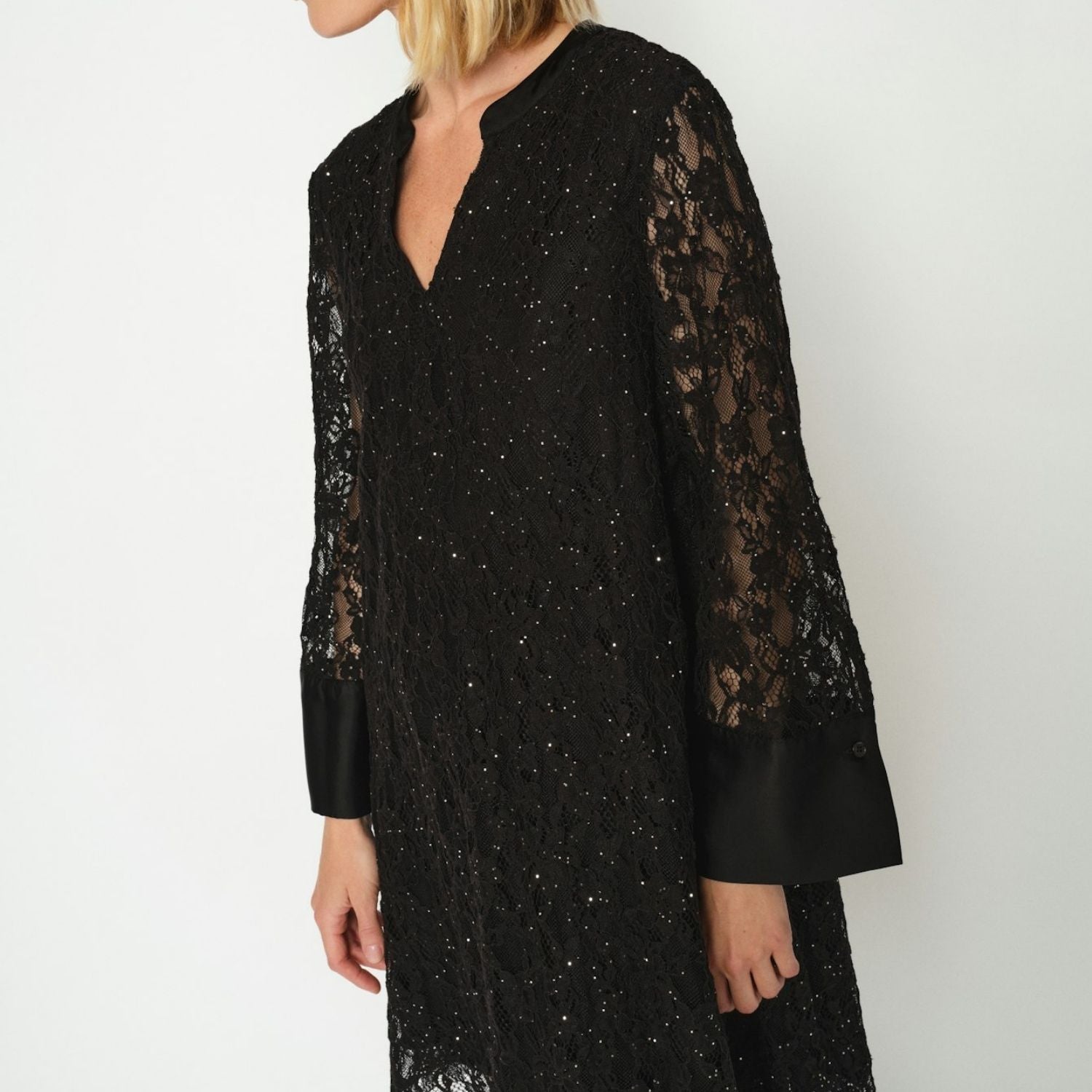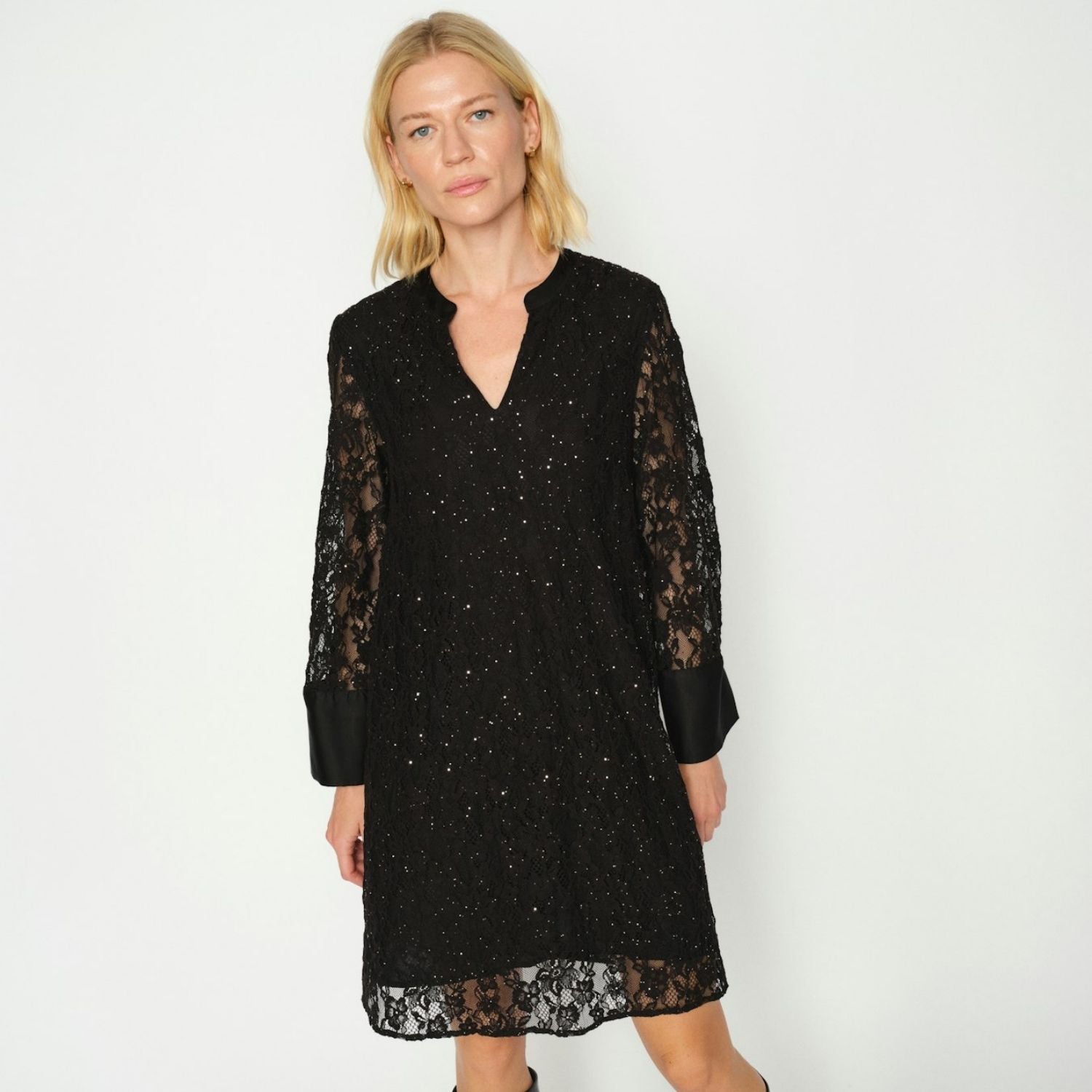 Sort blonde kjole fra Mos Mosh med lange løse ærmer.
