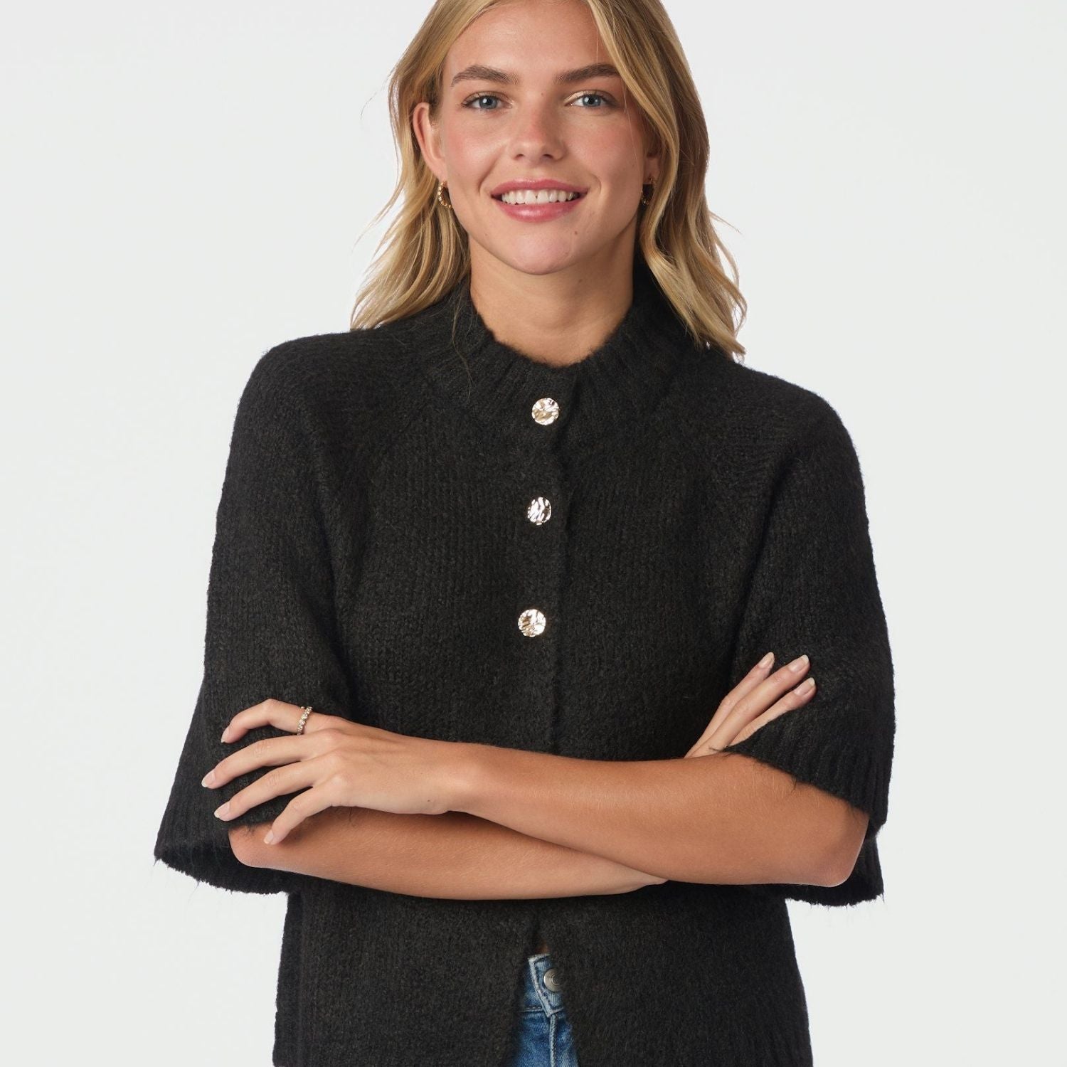 - Åben front med knaplukning ved brystet