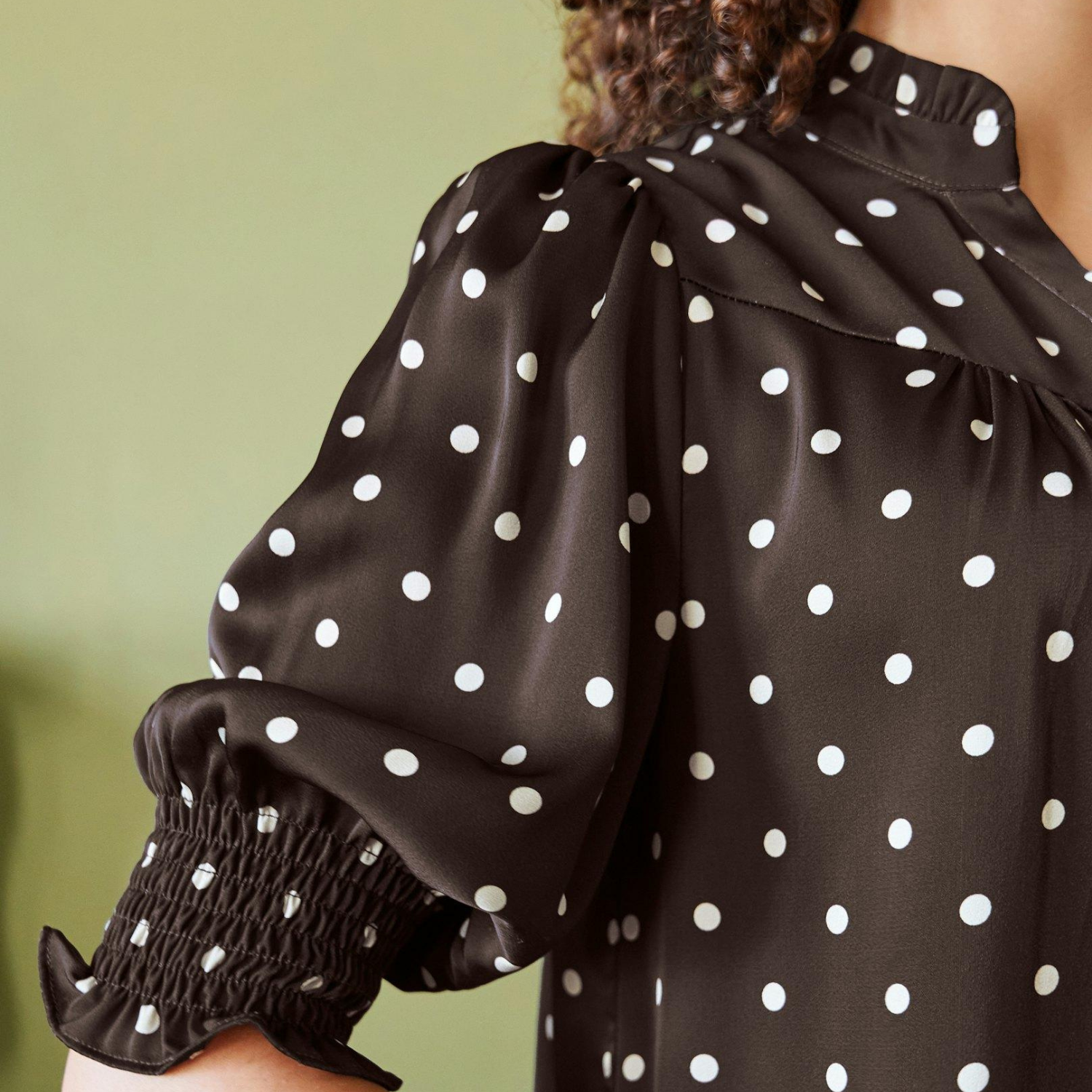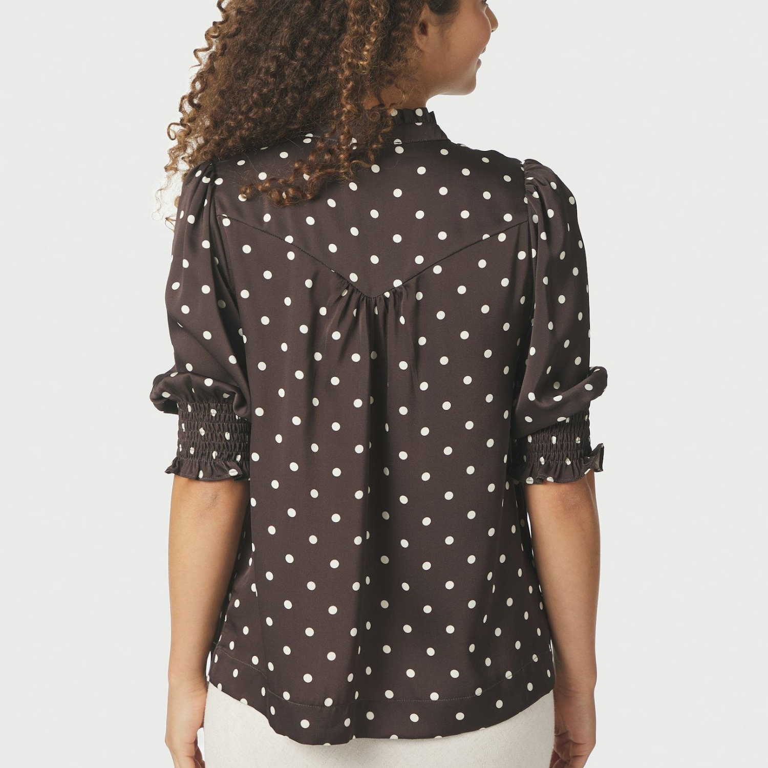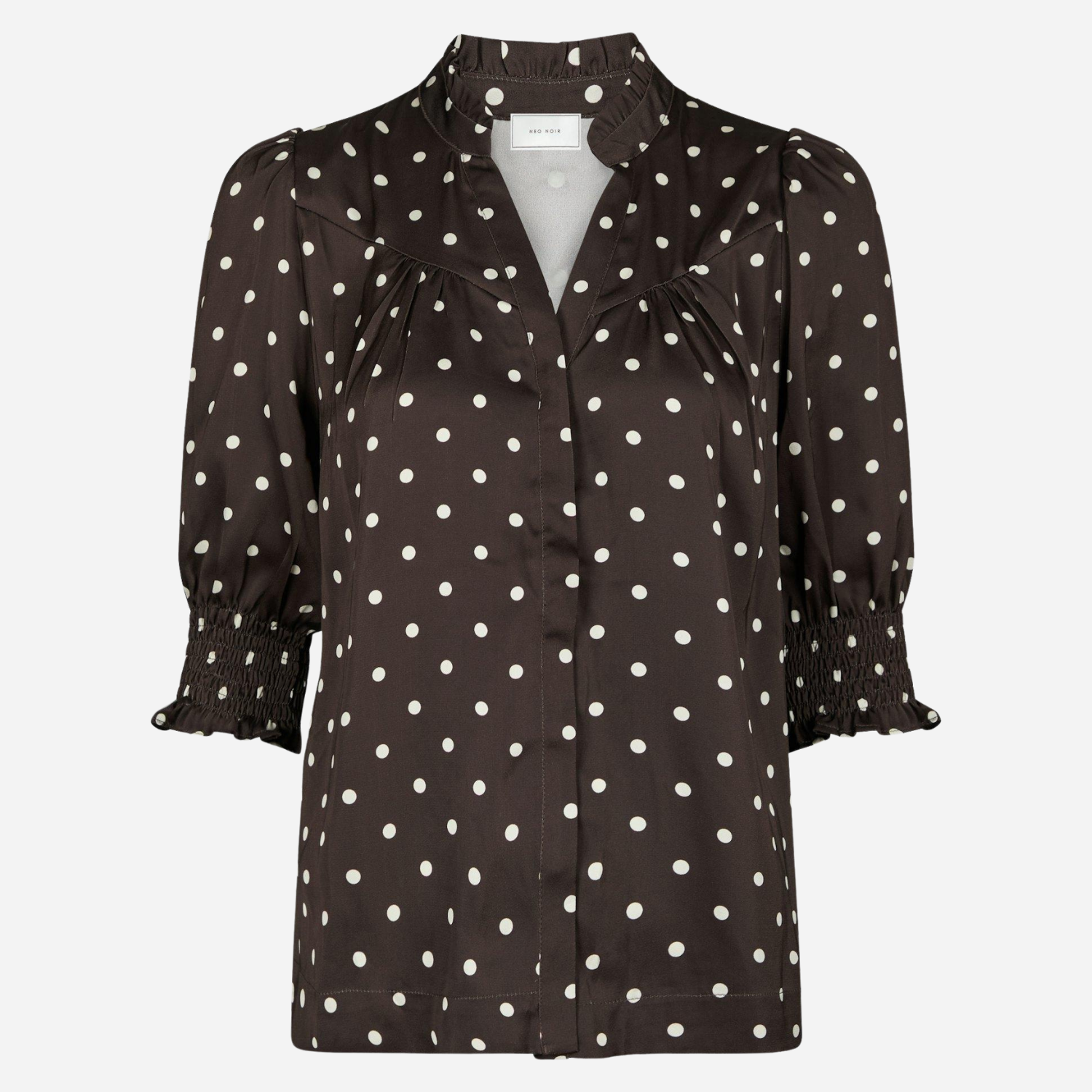 Helt mørkebrun satin bluse fra Neo Noir med hvide prikker.