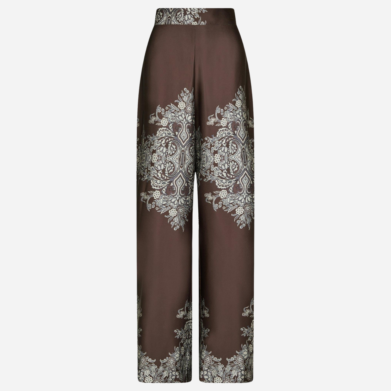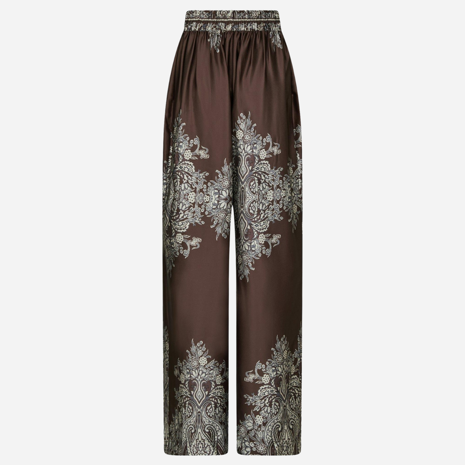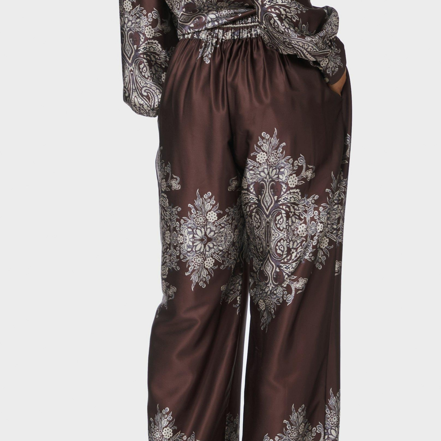 Mørkebrune satin bukser med flot print fra Neo Noir.