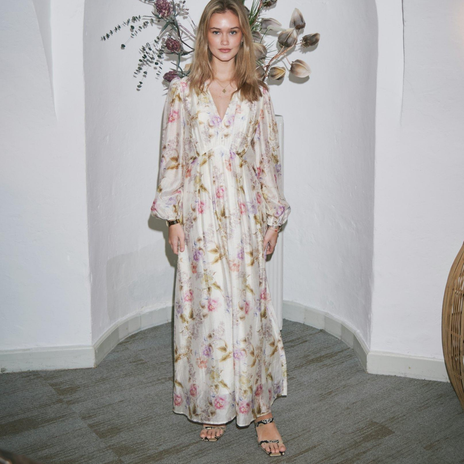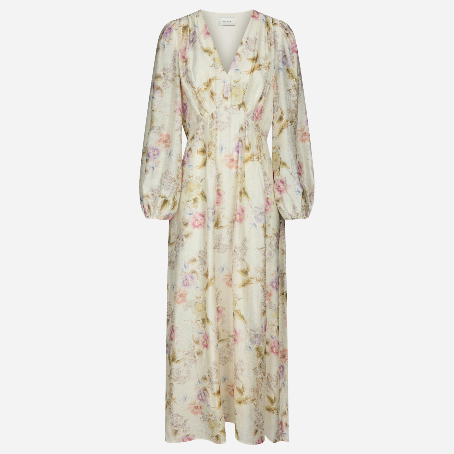 Smuk blomstermønstret kjole fra Neo Noir i råhvid med lange ærmer.