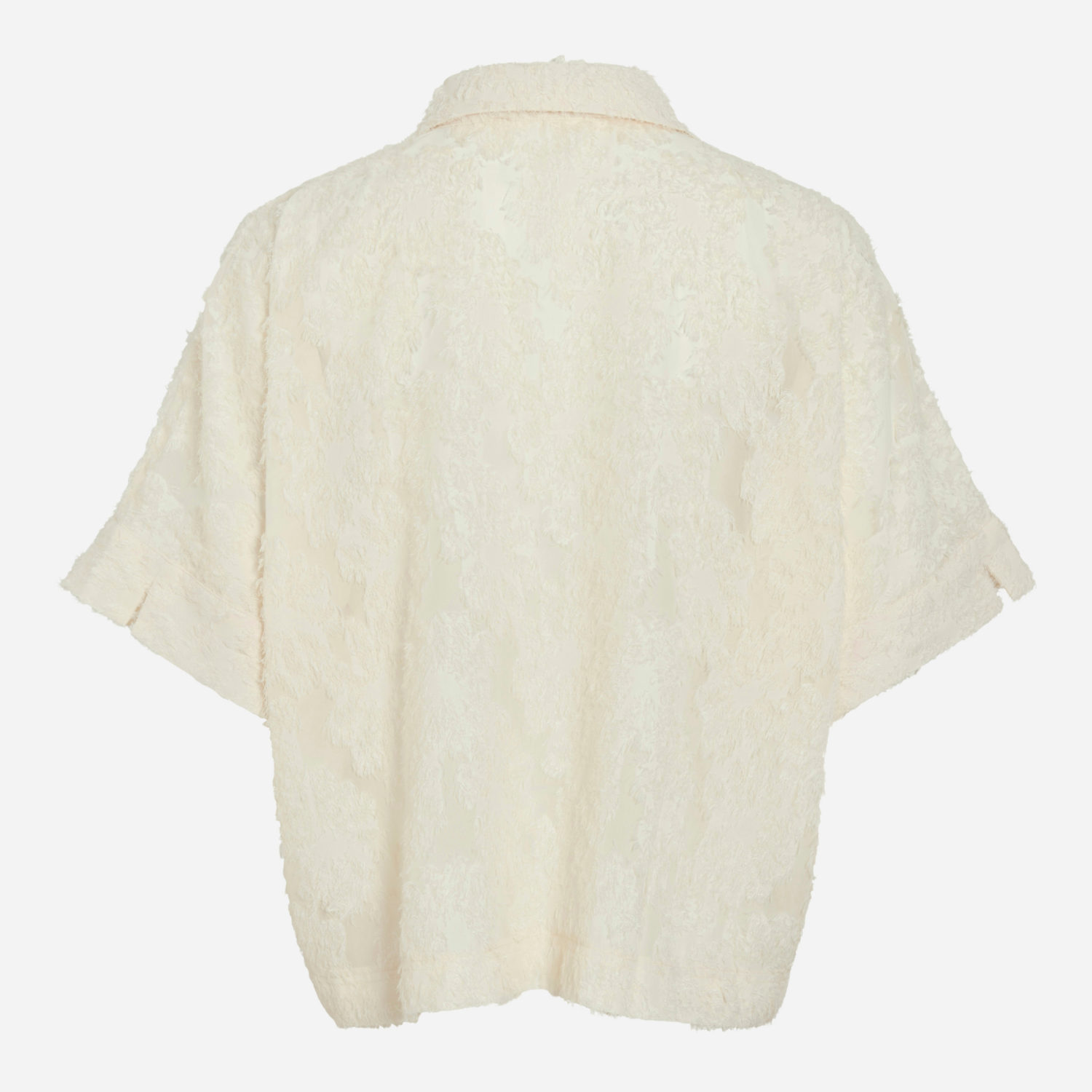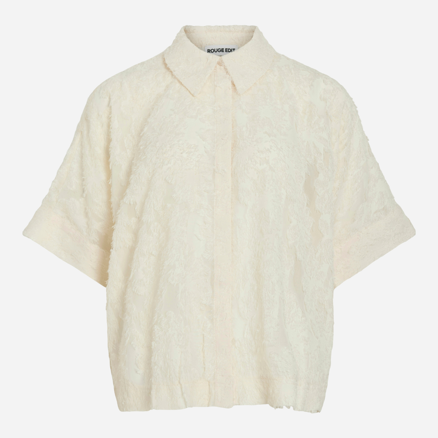 Smuk oversized kortærmet skjorte med frynser fra Rouge Edit i sandfarvet.