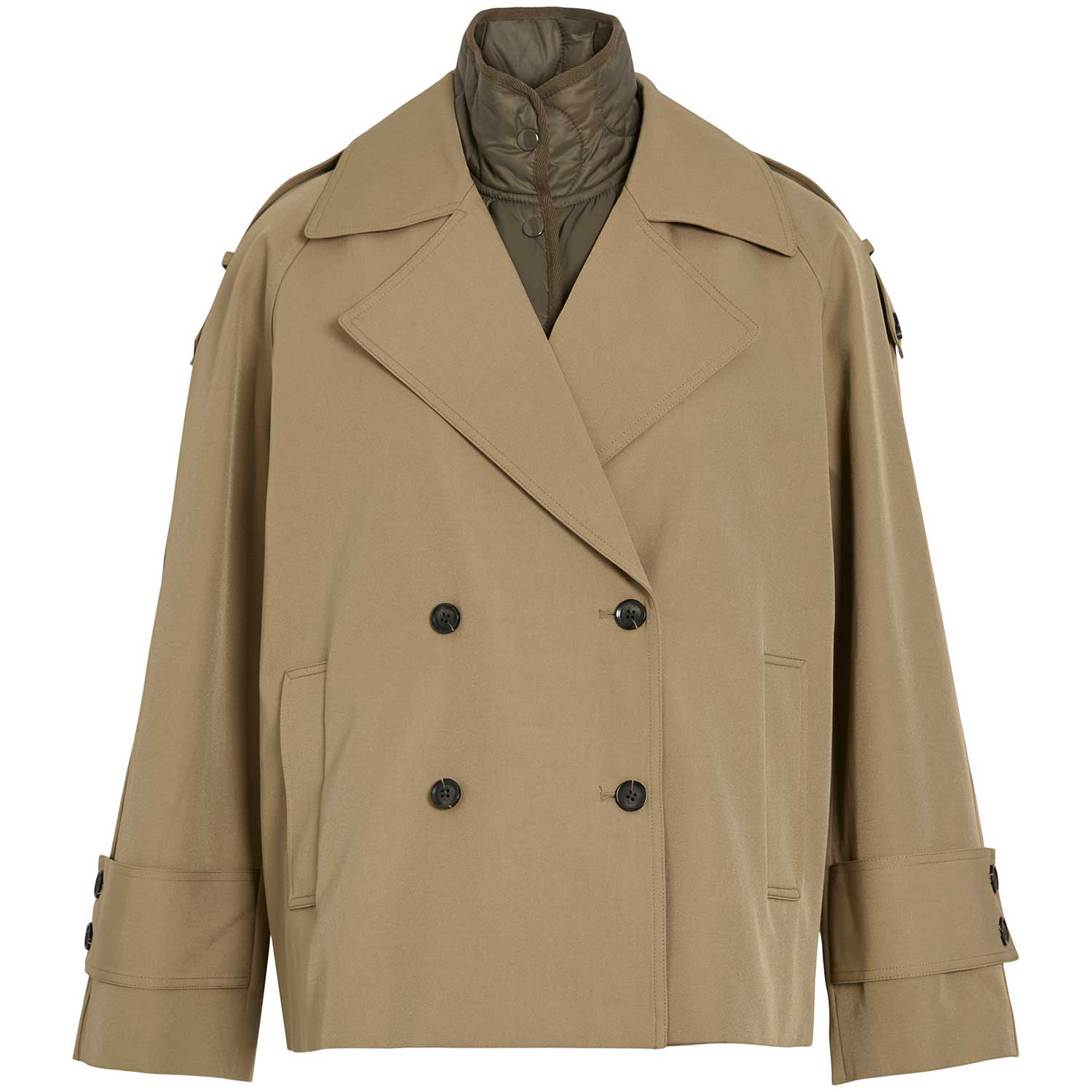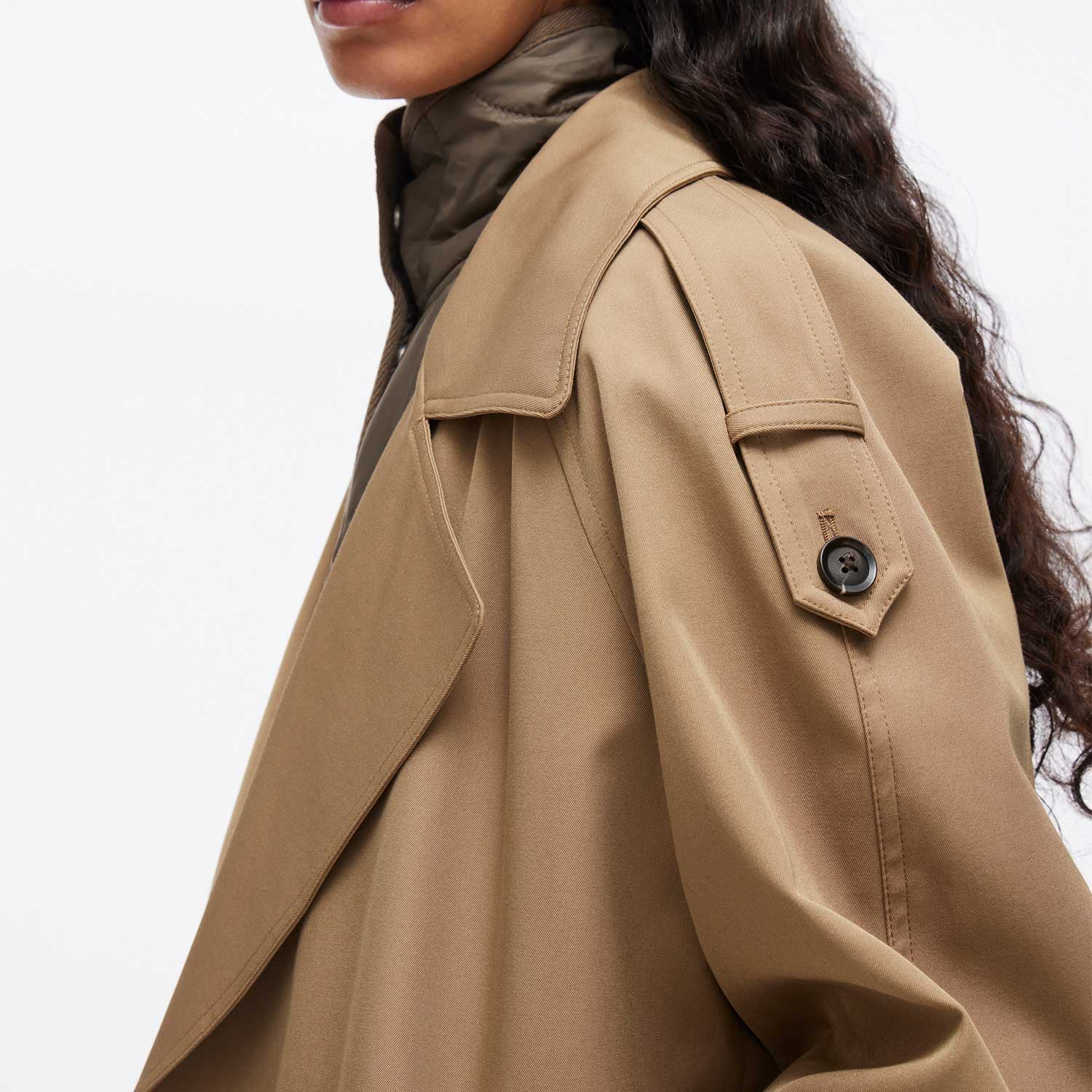Dobbeltradet kort trenchcoat jakke fra Rouge Edit i mørk sandfarvet.