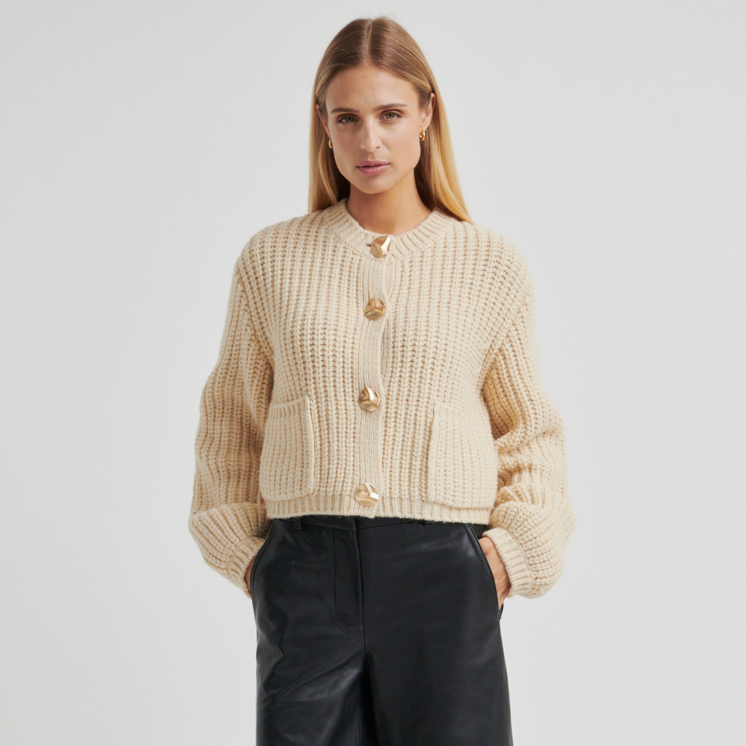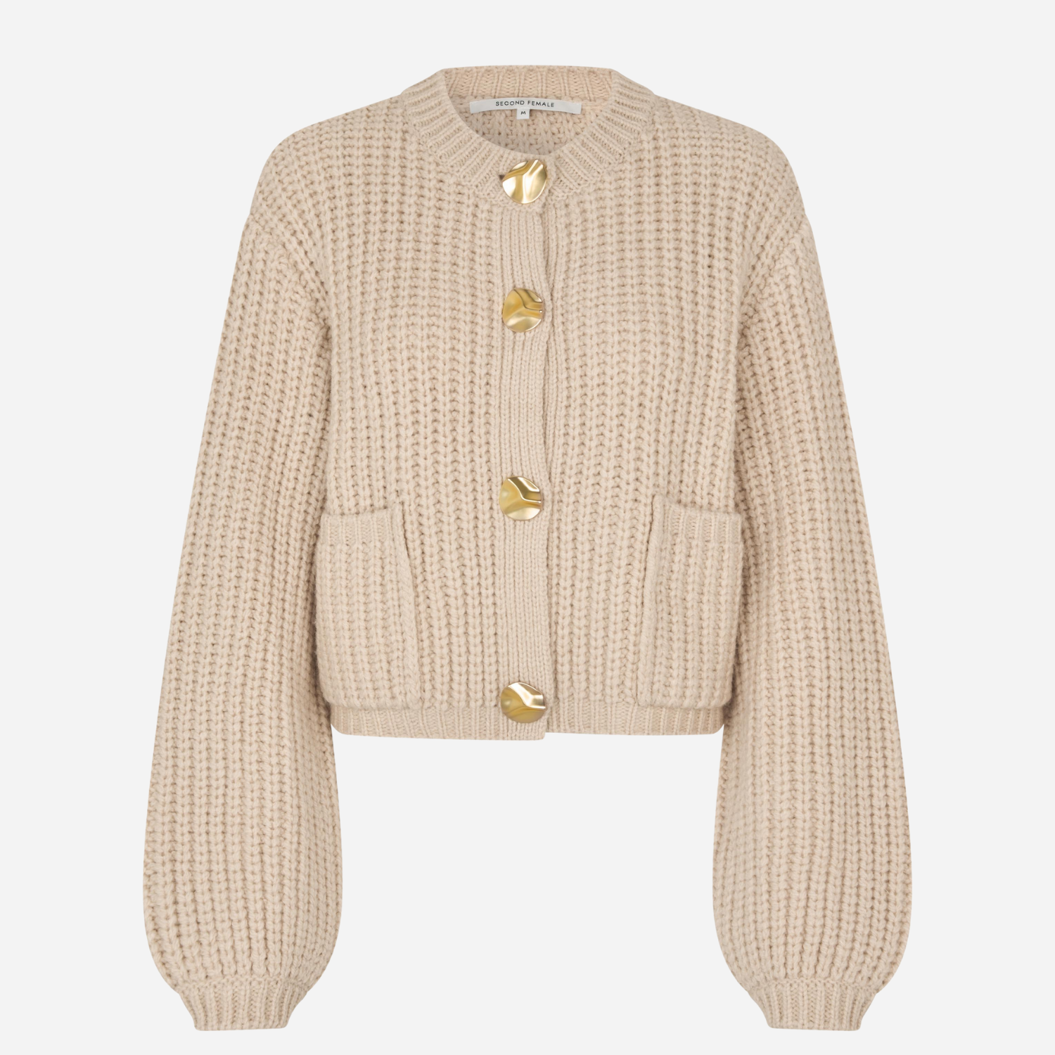 Grov strikket cardigan i lys sand fra Second Female